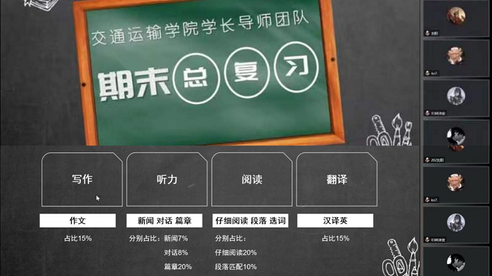 交通运输学院为助力该院学子积极备考,促进学生学习成绩的稳步提升,该院学长导师团队特此开展系列活动——成立云自习室、组织开展线上期末专项总复习以及线上考试相关注意事项的宣讲等。各项活动的积极开展,不仅促使该院形成了良好的学习氛围,同时,也推进了期末考试复习工作的高效开展。
