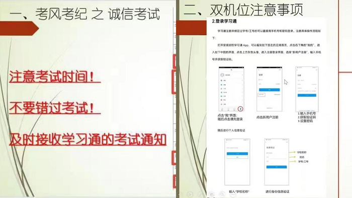 ——积极备考,诚信应考。针对线上考试,该院学长导师为大一同学详细地介绍了“双机位”考试的流程,与此同时,特此向同学们发出倡议,希望每一个同学都能把“以诚信应试为荣”铭记在心,辛勤耕耘,诚信考试,诚信做人,用真实可信的成绩展现自己学习能力和学习效果。