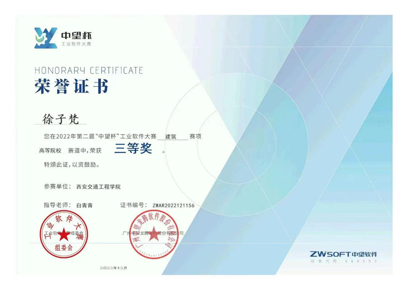 在备赛阶段,土木工程学院刘家铭和徐子梵同学在白青青老师的悉心指导下,认真研究赛项规程,夯实制(识)图基础知识,不断提升二维、三维制图技巧。凭借扎实的专业基础、过硬的技能素养、良好的心理素质,沉着应赛,最终参加了全国总决赛。经过激烈的角逐,刘家铭和徐子梵同学分别获得全国总决赛三等奖。