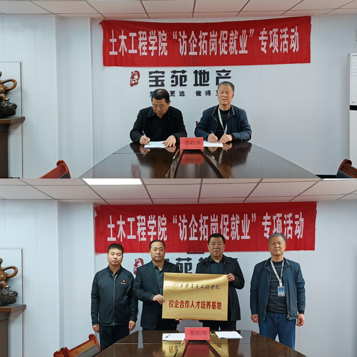 土木工程学院张院长和西安宝苑房地产有限公司签署了合作协议,王勇副校长为校企合作人才培养基地揭牌。本次校企合作协议签订为双方开展多层次、多领域合作搭建了平台,双方将进一步加强沟通联络,持续推进校企合作项目建设,为学生实习就业创造更好条件。