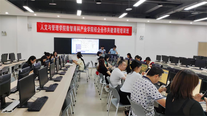 为加强教师队伍建设,培养一支高素质的师资团队,帮助新教师加深对新场景、新业务以及数智企业岗位技能的了解,更快提高业务能力和专业技能,将行业前沿新技术融入教学,加快课程教学适应数智化新趋势,8月23日,人文与管理学院数智商科产业学院举办了校企合作共建课程培训开班仪式。人文与管理学院院长赵德利、数智商科产业学院副院长王欣、财务管理教研室主任李海翔、齐欢欢及财务管理和电子商务任课教师参加了培训仪式。新道科技股份有限公司尼释元、张鹏、涂康、吴活波等企业代表进行培训指导。