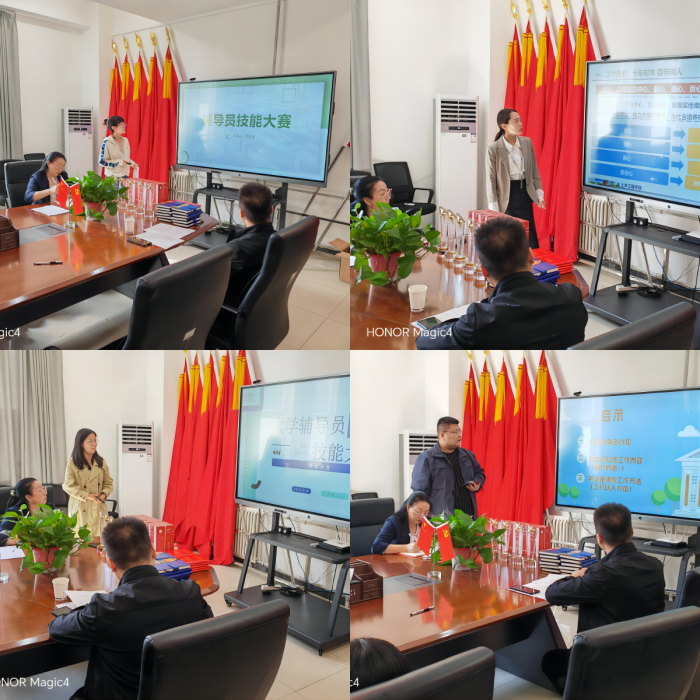 本次比赛分为自我介绍、主题演讲、工作技能展示、案例分析四个环节。内容涵盖辅导员职业认知、工作感受、特色成果,主要考察了辅导员的日常教育管理能力、语言表达能力、判断解决实际问题的能力、思想教育能力和辅导员对相关政策、学生基本情况、学生成长成才规律的了解把握及对学生的教育引导能力。