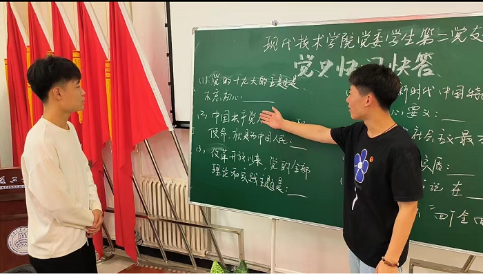 ——开展“树新风 立党心”党史快问快答活动。活动现场,同学们踊跃参与答题,展现了他们丰富的理论知识储备和积极的学习态度。此次活动一方面使得积极分子们更深入地了解党领导人民革命、建设、改革的历史,从伟大历程和辉煌成就中汲取动力,从优良传统吸取营养,从历史经验中获得智慧,对于坚定理想信念,增强宗旨意识,弘扬优良作风具有重要的现实意义;另一方面也为大家营造了互相学习、交流的氛围,引导大家树立终身学习理念,提高自身综合素质,更加坚定地为实现中国梦而努力奋斗。