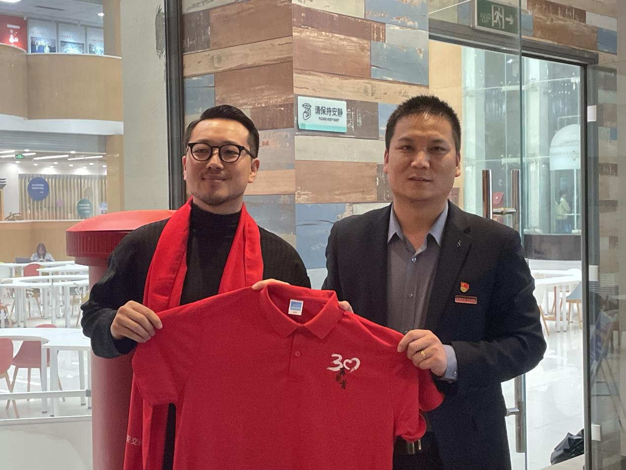 校友总会办公室主任王拓辉向左南赠纪念品