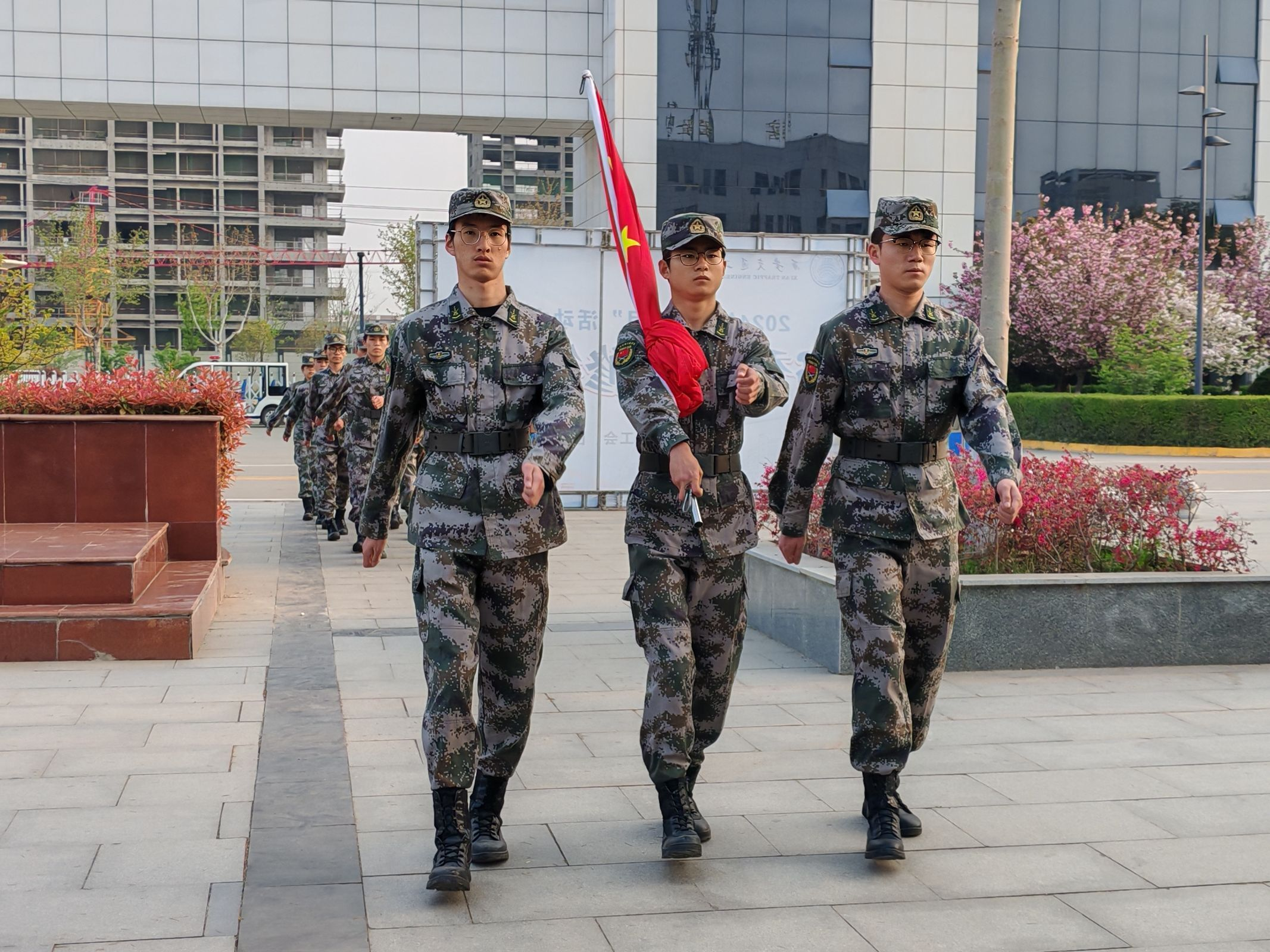 清晨7时整,升国旗仪式正式开始。国旗护卫队的队员迈着整齐划一、铿锵有力的步伐,护送着五星红旗正步走向旗杆。全体师生面向国旗肃立致礼。随着激昂的《义勇军进行曲》奏响,师生们注视着五星红旗冉冉升起,在熠熠晨光中迎风飘扬。
