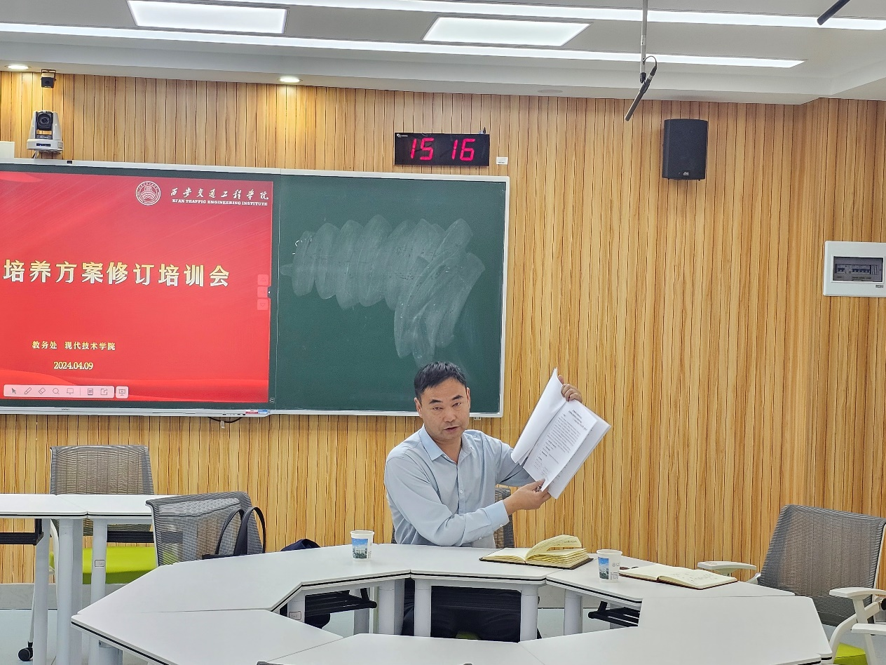 4月24日下午,现代技术学院在智慧教室开展了高职人才培养方案修订培训会。特别邀请了西安铁路职业技术学院交通运输学院的副院长刘新强,陕西铁路工程职业技术学院教务处副处长杨勃与我院各个专业带头人进行交流,现代技术学院都院长主持此次培训会。