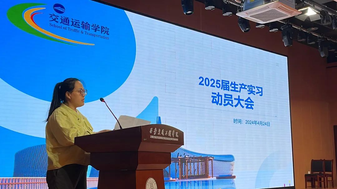 为了确保交通运输专业2024届毕业生生产实习工作的顺利进行,引导同学们对生产实习有一个正确的认识和态度,保质保量的完成此次教学任务。4月24日,交通运输学院在学术报告厅召开生产实习动员大会。陕西城际铁路有限公司工程师吴宏,学校教务处副处长齐军营、交通运输学院院长崔炳谋、交通运输学院党委书记胡省利、交通运输学院副院长王亚欧、各位生产实习带队教师及交通运输学院2021级本科和2023级专升本588名学生参加会议,会议由交通运输学院张欢老师主持。