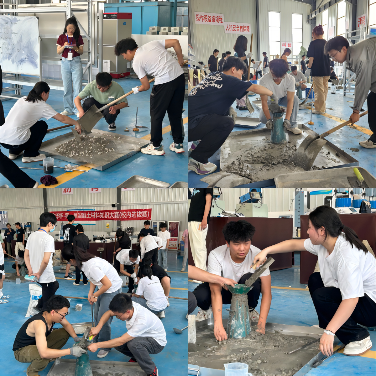 本次大赛设计主题是:以有利于混凝土耐久性为原则,采用机制砂配制“C40大流态绿色高性能混凝土”,并考虑工程应用环境和经济性,展示大学生解决复杂工程问题的能力。通过前期宣传与推广,共计有100多名学生参赛,比赛场地设置在土木与铁道工程学院工程实验训练中心。比赛成绩依据参赛队伍的混凝土配合比设计、操作技能、现场拌合物的性能予以评判。混凝土配合比设计环节重点考察参赛队伍设计方案的合理性、经济性和适用性;操作技能环节重点考察参赛选手操作规范性、熟练程度及现场配合比调整的应变能力;拌合物性能评价环节重点考核参赛队伍所得新拌混凝土工作性与期望结果之间的匹配度、对测试结果整理的规范性、分析的严谨性和科学性。