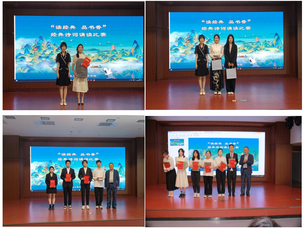 由图书馆副馆长黄晓燕宣读了获奖名单。人文与管理学院崔一诺朗诵的《以时代之眼,我们这样看中国》获得一等奖;人文与管理学院王明月朗诵的《将进酒》和陈圆圆朗诵的《蜀道难》获得二等奖;机械与电气工程学院左天宇朗诵的《大写的中国》、人文与管理学院敬怡寒朗诵的《再别康桥》、机械与电气工程学院李家辉小组朗诵的《少年中国说》获得三等奖;人文与管理学院杨钦青朗诵的《水调歌头·明月几时有》等五个作品获得了优秀奖。最后由团委书记王小英及图书馆馆长宇文高峰编审为获奖同学颁发获奖证书及奖品,并与获奖者合影留念。