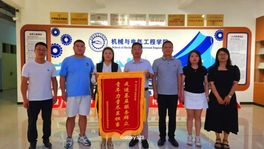 为表达对机械与电气工程学院志愿服务工作的敬意和谢意,进一步发扬学院建立的长期志愿服务进取精神,6月7日,西街社区为我院送上一面题词为“走进基层服务群众,青年力量尽显担当”的锦旗。副校长石广田教授、学院党委书记王拓辉、党委成员王新焕、赵伟冬、西街社区工作人员参加此次活动。