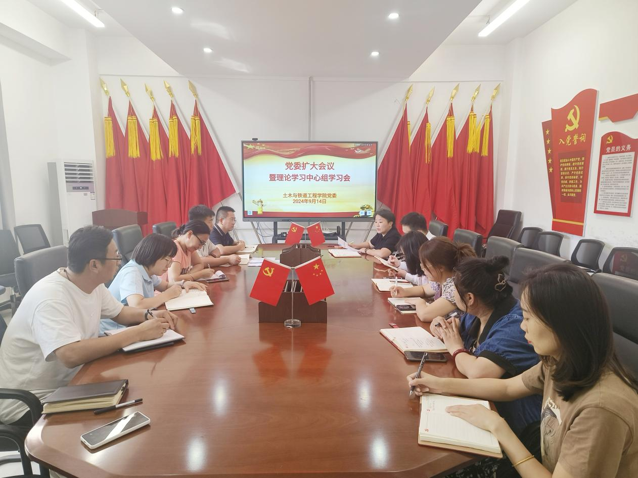 9月14日下午,土木与铁道工程学院召开了党委扩大会议暨理论学习中心组学习会,该院党委委员、各支部委员参加会议。会议由该院党委副书记张雯雯主持。