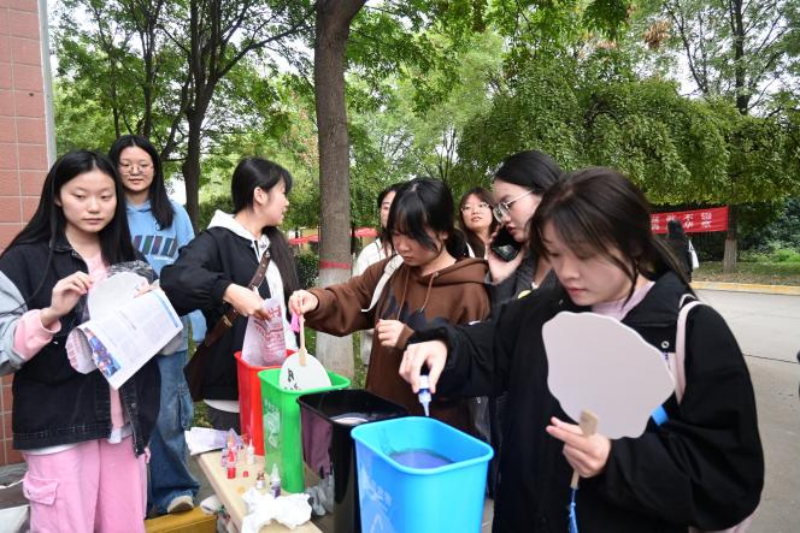 现场热闹非凡,同学们满怀期待地开启了这场创意之旅。老师也兴致满满的参与到漆扇制作当中,与同学们一同感受中华优秀传统文化的魅力。老师时而专注地制作着自己的扇子,时而抬头观察同学们的进展,用行动为大家加油鼓劲。在制作过程中,大家互相交流心得,分享创意,每一把都承载着大家的努力和对传统文化的热爱,一笔一划都倾注着对美的追求和对传统文化的敬意。