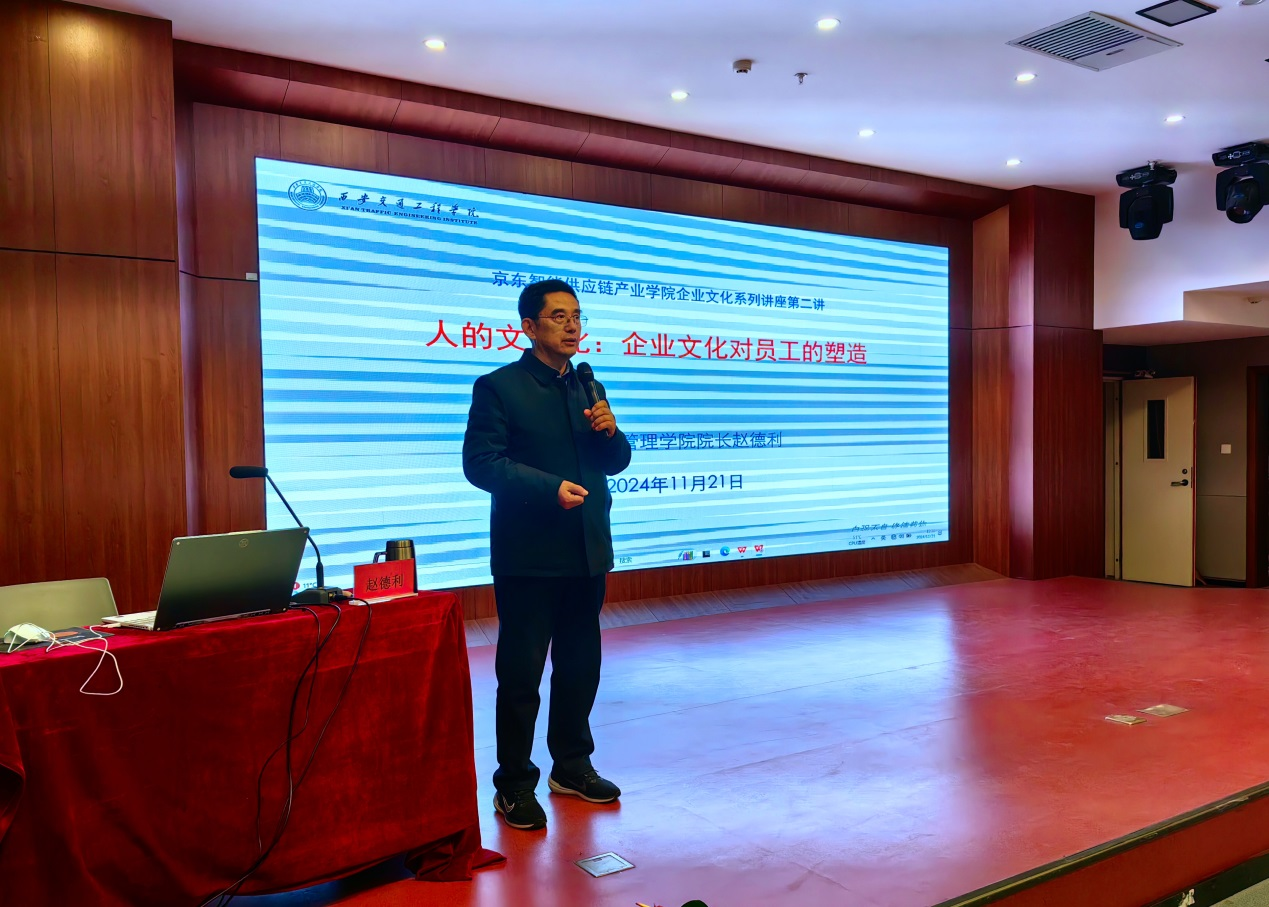 按照人文与管理学院对产业学院一年级学生素质拓展的讲授计划,11月21日晚上,京东智能供应链产业学院在集贤楼二楼报告厅成功举办企业文化系列讲座第二讲——企业文化对员工的塑造。本次讲座由人文与管理学院院长赵德利教授主讲,人文与管理学院2024级物流管理与电子商务专业(包含专升本)学生参加了报告会。