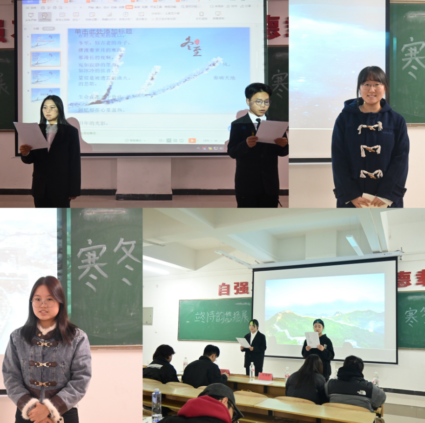 为弘扬中华优秀传统文化,提升学生文化素养,增强文化自信与民族自豪感,12月8日,交通运输学院举办“立冬诗韵悠扬展,寒冬朗诵别样欢”诗歌朗诵比赛在5-201教室顺利举行。