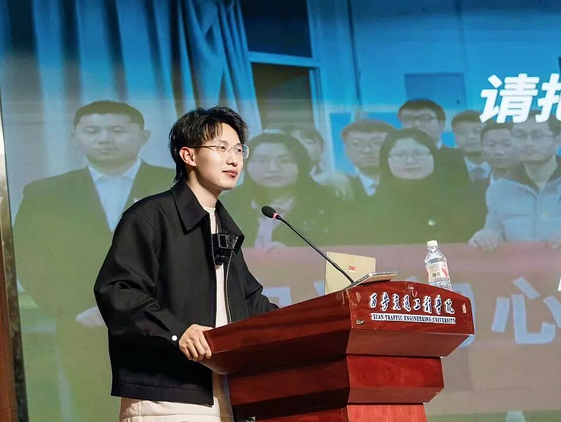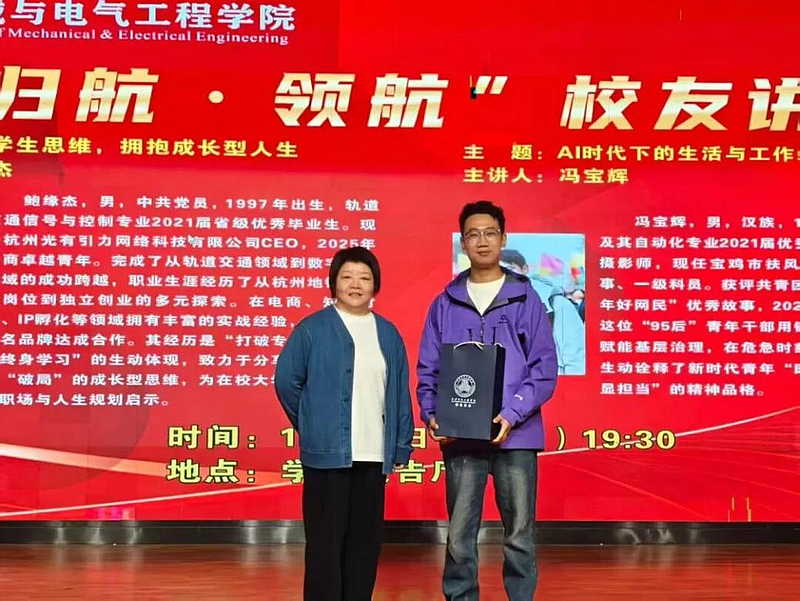活动伊始,王拓辉向在场师生介绍了两位校友的成长历程与奋斗故事。鲍缘杰,机械与电气工程学院轨道交通信号与控制专业2021届省级优秀毕业生,现任杭州光有引力网络科技有限公司CEO,荣获“2025年浙商卓越青年”称号;冯宝辉,电气工程及其自动化专业2021届优秀毕业生,曾任《华商报》社摄影师,现为宝鸡市扶风县召公镇人民政府宣传干事,荣获“2024年陕西青年好网民”“宝鸡好网民”称号。校友工作办公室主任王华代表学校向两位校友赠送纪念礼物,表达母校的深切祝福与殷切期望。
