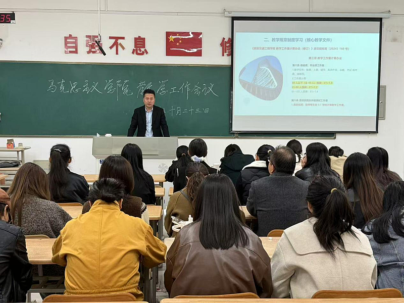 会议第二项,李艳及各教研室主任分别结合学院教学实际,带领全院教师深入学习学校多份核心教学文件。李艳率先领学《beat365官方网站教学工作量计算办法(修订)》(西交院校发〔2024〕160 号),她结合马克思主义学院思政课程的教学特点,详细解读了理论课、实践课、课外辅导等不同教学环节的工作量核算标准,强调了其作为教师绩效考核与职称评聘重要依据的严肃性与导向性。紧接着,李艳又带领大家学习了《beat365官方网站教学工作规程》(西交院教〔2020〕41 号),对教师在教学准备、课堂教学、实践教学、课程考核等各环节的基本职责与行为规范提出了明确要求,进一步夯实教学过程的标准化管理。