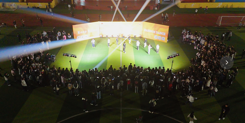 一阵熟悉的流行音乐前奏划破长空,散布在操场各处的同学们仿佛听到了“行动暗号”,从四面八方迅速向场地中央汇聚。开场一曲《CRZY》瞬间引爆全场,领舞者们活力四射,周围同学深受感染纷纷加入,原本宁静的体育场在几分钟内,便化身为一个气氛热烈的巨型露天舞池。