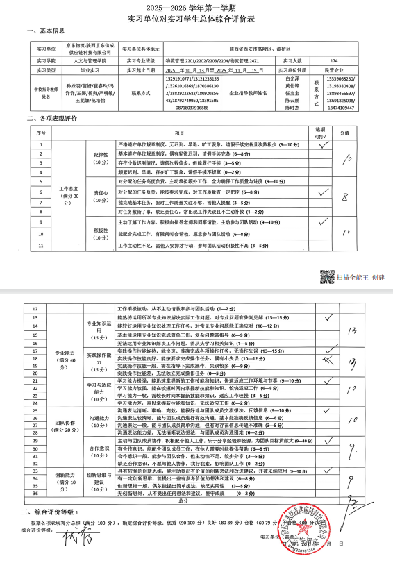 近日,人文与管理学院2026届物流管理专业174名学生圆满完成在京东物流5大园区的毕业实习任务。凭借扎实的专业素养、务实的工作态度与较强的实践能力,实习学生群体获得京东物流的全面肯定,公司给出“综合评价为优”的高度赞誉,其中41名表现突出的学生更是斩获京东物流 “绿色就业通道证书”,为毕业就业奠定坚实基础。