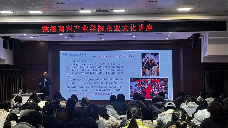 12月4日,人文与管理学院院长赵德利在集贤楼二楼报告厅为用友|新道数智商科产业学院财务管理专业2025级240余名学生作了题为《人的文化化:企业文化对员工的塑造》的专题讲座。旨在引导学生深入理解文化的内涵、企业文化的作用及其对个人职业发展的深远影响。