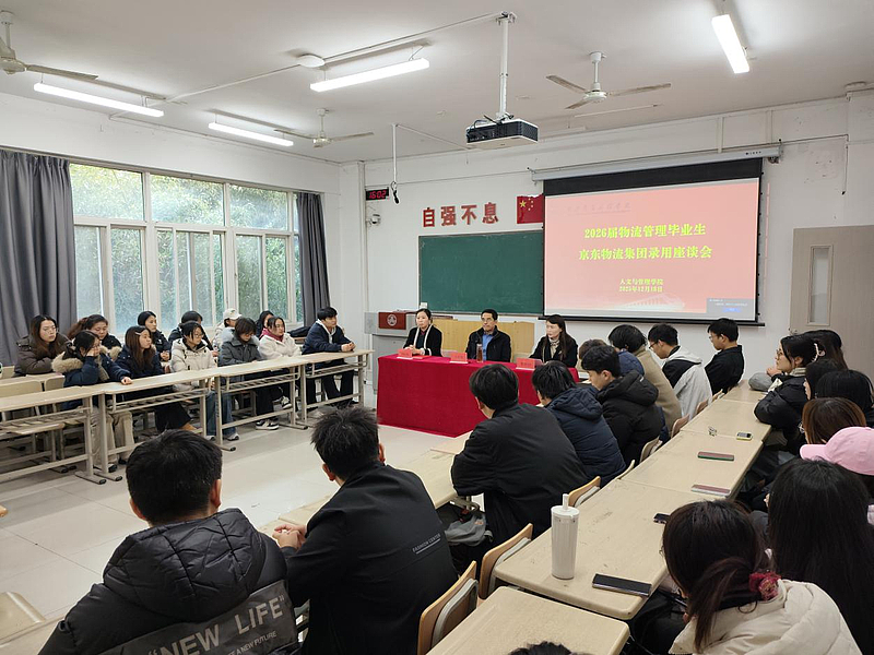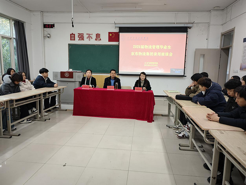 12月18日下午,人文与管理学院在3-209召开2026届物流管理专业毕业生京东物流集团录用座谈会暨就业动员会。人文与管理学院院长赵德利、党委书记兼副院长李沙沙、物流管理教研室主任刘红利和40名成功获得京东物流集团录用资格的2026届物流管理专业毕业生参加会议。会议由辅导员杨馨烨老师主持。