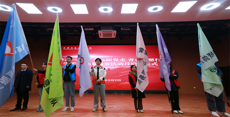 副校长王勇同志、党委宣传部部长界威锋同志先后为校院两级志愿服务队授旗。