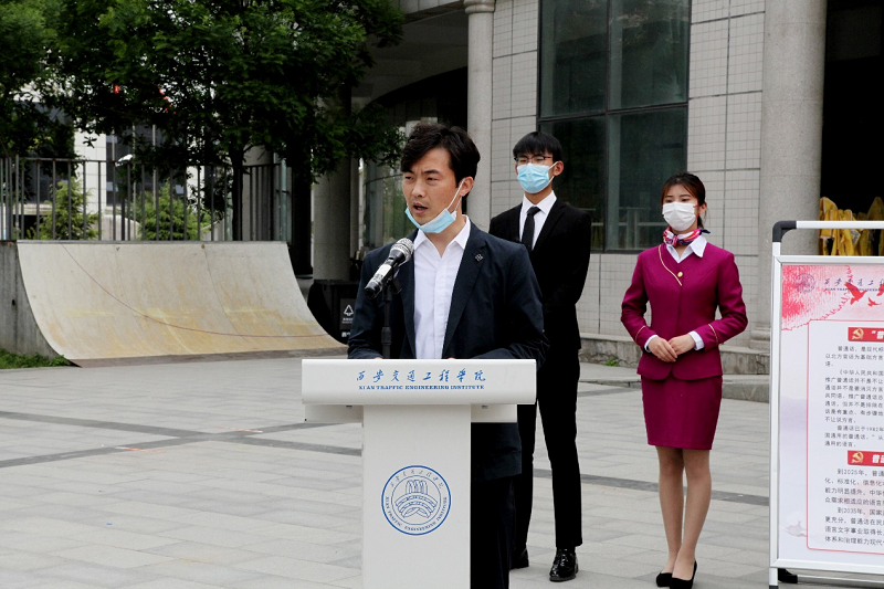 学生代表王芝君向全校学生发出倡议:积极行动起来,从自己做起,从现在做起!让普通话成为校园语言!用普通话化解隔阂,用普通话沟通心灵!让普通话响彻校园的每一个角落。