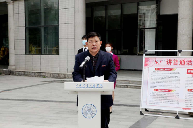 刘校长在致辞中介绍了普通话的悠久历史、在祖国统一中的意义以及世界影响,他号召全校师生让每一课堂成为普通话的宣传窗口,坚持课内课外交流使用普通话,让校园的每一面墙、每一块黑板、每一个橱窗成为规范汉字的镜子;在家庭生活和社会交往中坚持使用普通话,使用规范汉字,让每一位师生成为文明使者,要把说普通话和维护祖国语言的纯洁同民族精神结合起来,使学普通话、说普通话成为一种维护民族荣誉、崇尚祖国汉语言文化的行为。